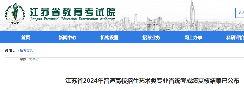 江蘇省2024年普通高校招生藝術(shù)類專業(yè)省統(tǒng)考成績復(fù)核結(jié)果已公布,已申請的考生可自行登錄省教育考試院網(wǎng)站(www.jseea.cn)查詢。