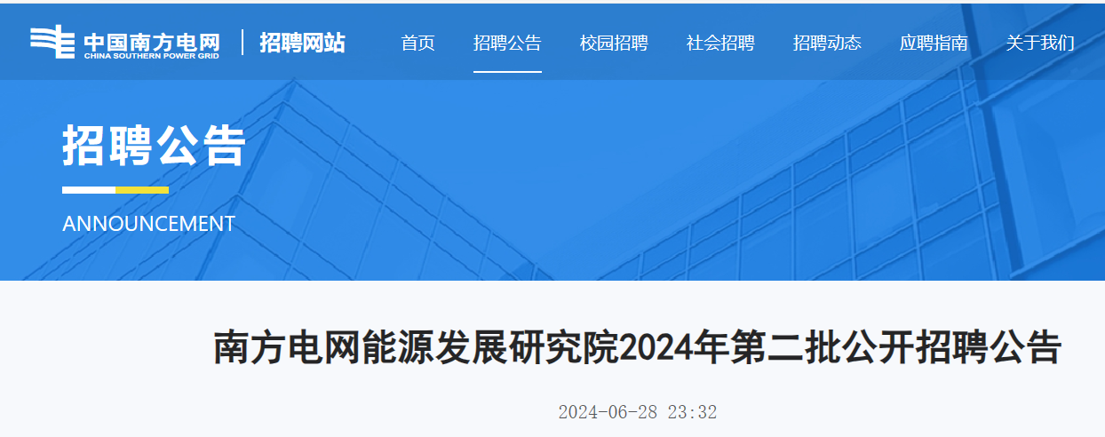 2024年南方電網(wǎng)能源發(fā)展研究院第二批公開招聘公告已發(fā)布,報名時間:即日起到2024年7月11日17:00?,F(xiàn)將招聘公告原文發(fā)布如下: