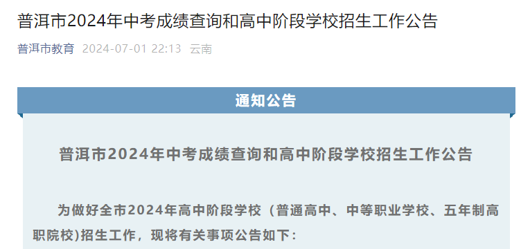 從普洱市教育局獲悉,2024年云南普洱市中考成績(jī)查詢(xún)、志愿填報(bào)、招生錄取工作公告已公布,7月2日9:00以后查分,具體詳情如下: