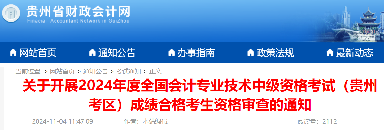 小編根據貴州省財政會計網發(fā)布”關于開展2024年度全國會計專業(yè)技術中級資格考試(貴州考區(qū))成績合格考生資格審查的通知“得知,貴州2024年中級會計職稱資格審核時間為2024年11月5日至11月20日,詳情如下: