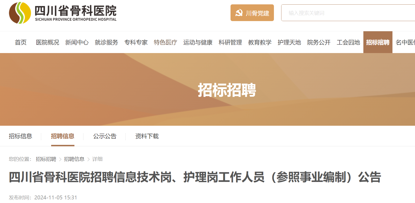 2024年四川省骨科醫(yī)院招聘信息技術(shù)崗、護(hù)理崗工作人員(參照事業(yè)編制)公告已發(fā)布,簡(jiǎn)歷收取時(shí)間為2024年11月6日至2024年11月12日17:00?,F(xiàn)將招聘公告原文發(fā)布如下: