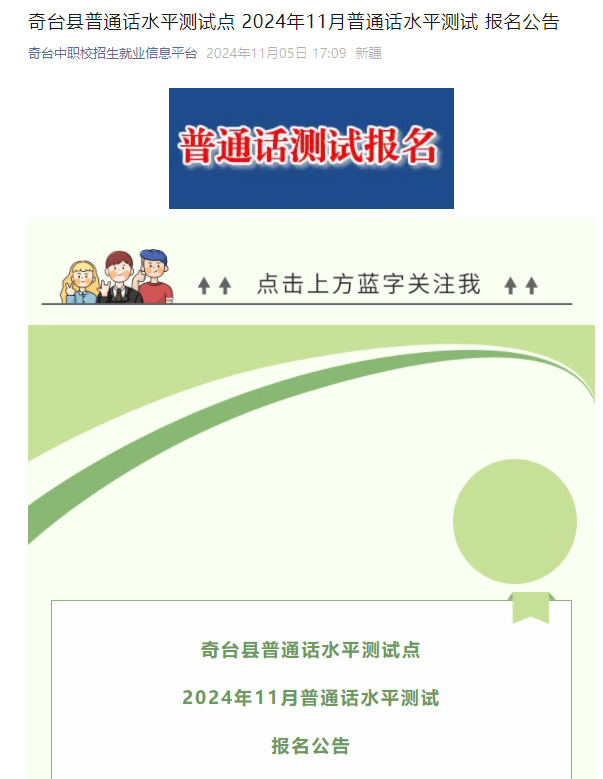 現(xiàn)就2024年11月奇臺(tái)縣普通話水平測(cè)試報(bào)名事宜公告如下: