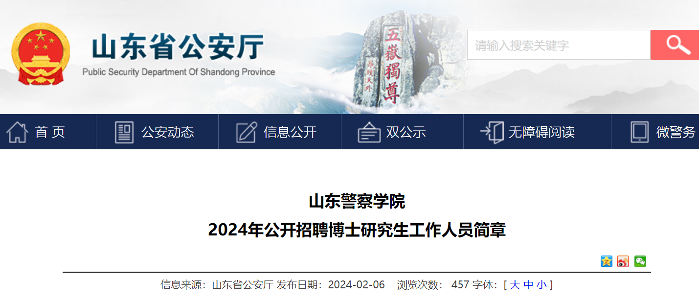 根據(jù)中共山東省委組織部、山東省人力資源和社會(huì)保障廳關(guān)于印發(fā)《2024年度省屬事業(yè)單位公開(kāi)招聘工作實(shí)施方案的通知》(魯人社發(fā)〔2023〕14號(hào))要求和學(xué)校實(shí)際工作需要,本次面向社會(huì)公開(kāi)招聘博士研究生工作人員30名,具體崗位及條件詳見(jiàn)《山東警察學(xué)院公開(kāi)招聘博士研究生工作人員崗位匯總表》(附件1)。