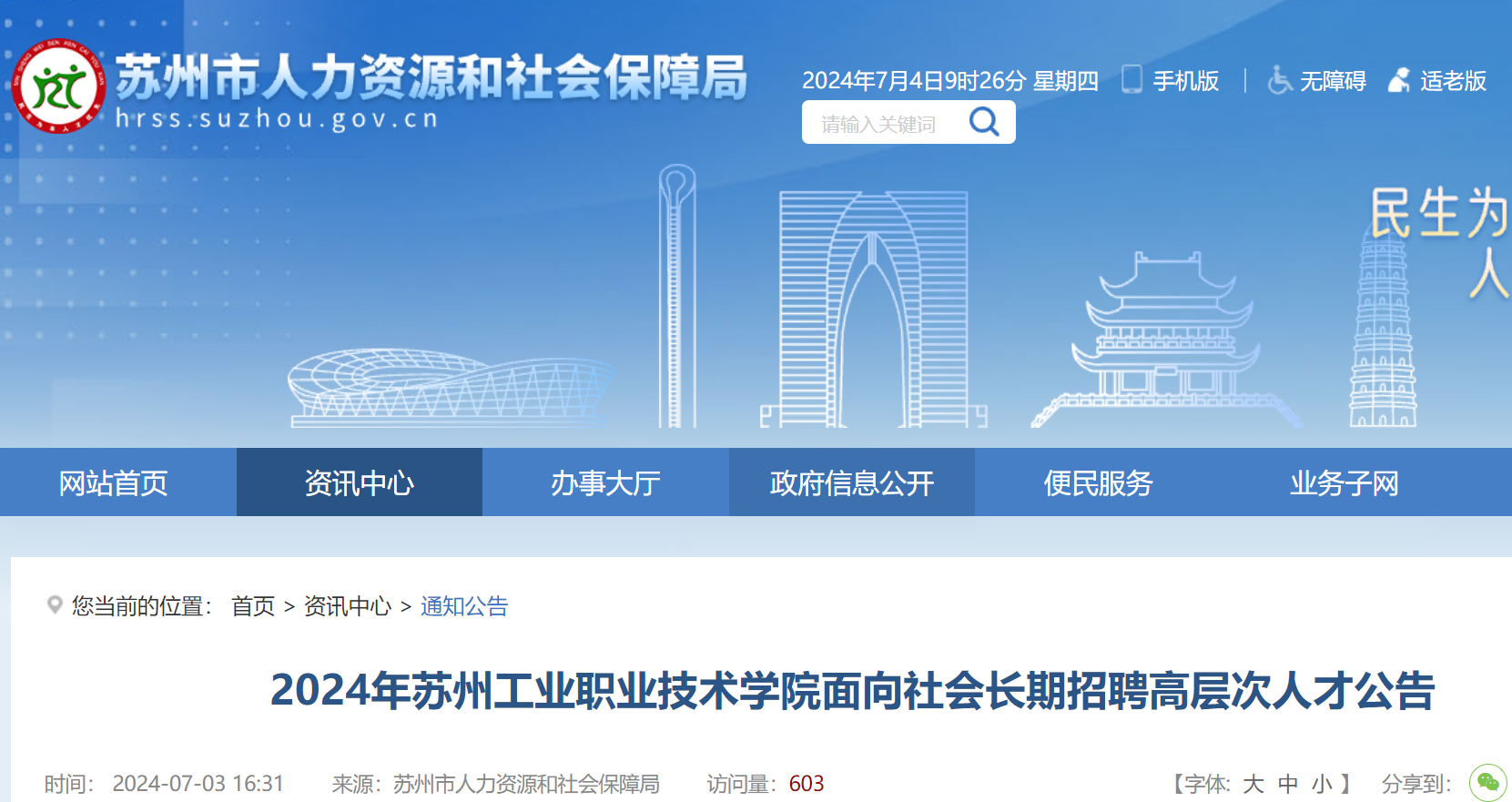 根據(jù)《江蘇省事業(yè)單位公開招聘人員辦法》(蘇辦發(fā)〔2020〕9號(hào)),經(jīng)蘇州市人力資源和社會(huì)保障局批準(zhǔn),蘇州工業(yè)職業(yè)技術(shù)學(xué)院面向社會(huì)長期招聘高層次人才12名(列入高校人員總量管理),現(xiàn)將有關(guān)事項(xiàng)公告如下: