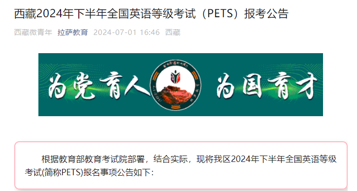 從西藏自治區(qū)教育考試院獲悉,西藏2024下半年全國(guó)英語(yǔ)等級(jí)考試PETS報(bào)考公告已公布,7月4日16:00截止報(bào)名,具體詳情如下: