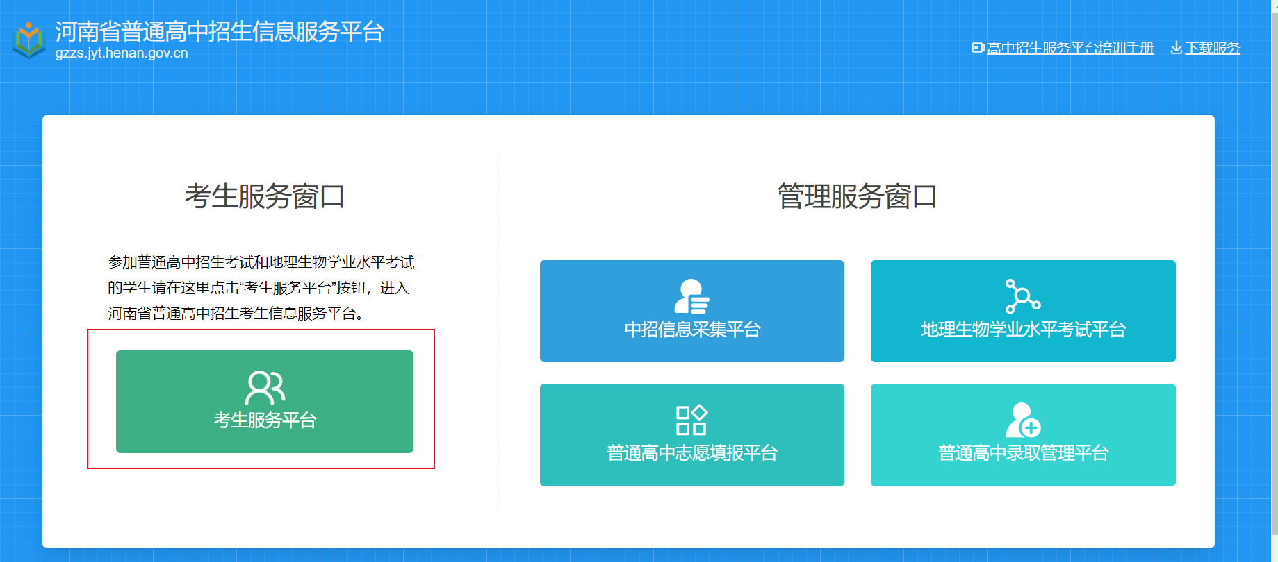 1.進(jìn)入“河南省普通高中招生信息服務(wù)平臺(tái)”(http://gzzs.jyt.henan.gov.cn/),點(diǎn)擊“考生服務(wù)平臺(tái)”。