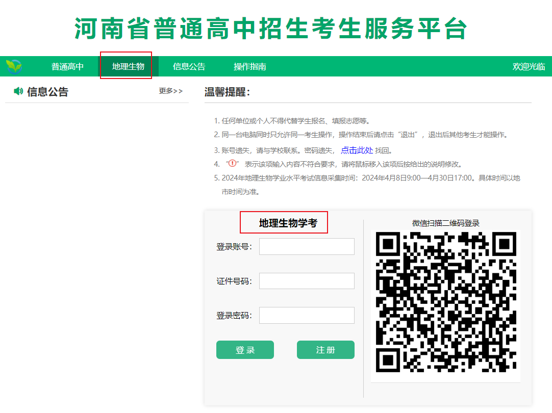 八年級(jí)考生點(diǎn)擊菜單欄“地理生物”,輸入考生信息登錄查詢。