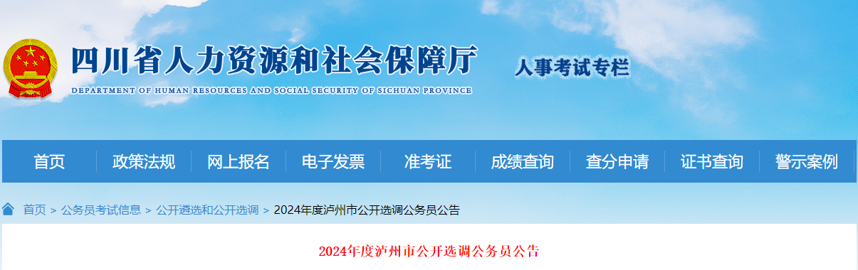 根據(jù)公務(wù)員法和《公務(wù)員調(diào)任規(guī)定》《四川省公務(wù)員調(diào)任實(shí)施辦法》《瀘州市科級(jí)領(lǐng)導(dǎo)干部調(diào)任實(shí)施辦法》等政策法規(guī),中共瀘州市委組織部決定開(kāi)展2024年度公開(kāi)選調(diào)公務(wù)員工作?,F(xiàn)將有關(guān)事項(xiàng)公告如下: