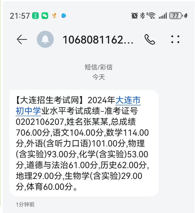 成績發(fā)布時,考生將通過在大連招生考試網(wǎng)預(yù)約登記確認(rèn)的手機號碼,獲取考試成績短信消息,請注意查收。