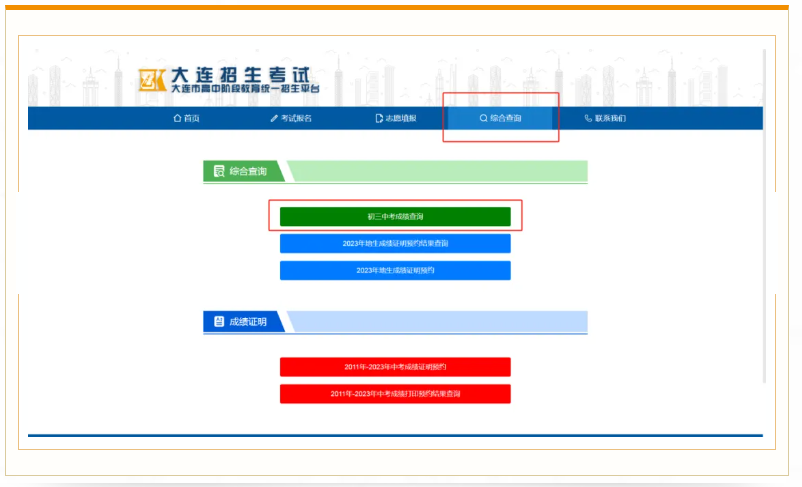 方法二:在瀏覽器輸入“https://dlzsks.edu.dl.gov.cn” 進入大連招生考試網(wǎng)。依次點擊【綜合查詢】、【初三中考成績查詢】。