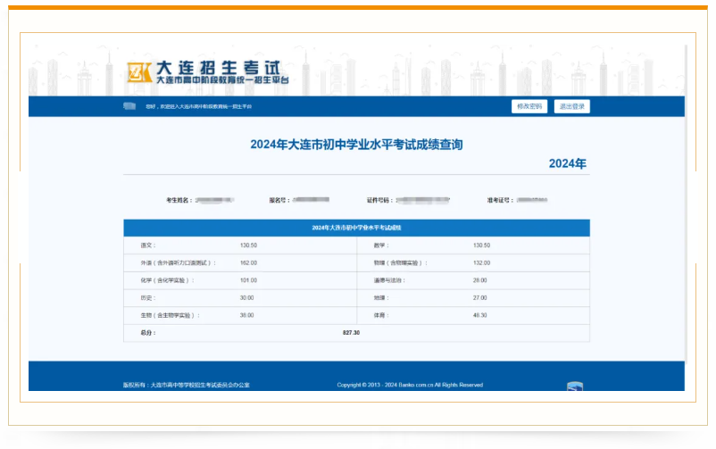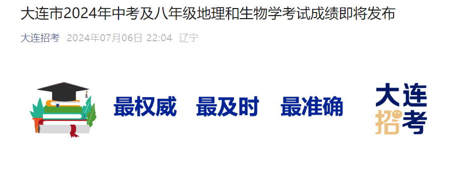 小編根據(jù)大連招考發(fā)布“大連市2024年中考及八年級地理和生物學(xué)考試成績即將發(fā)布”得知,2024年遼寧大連中考成績查詢時間為7月9日,查分方式如下: