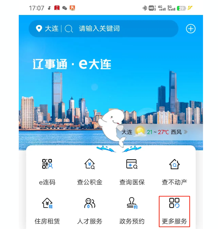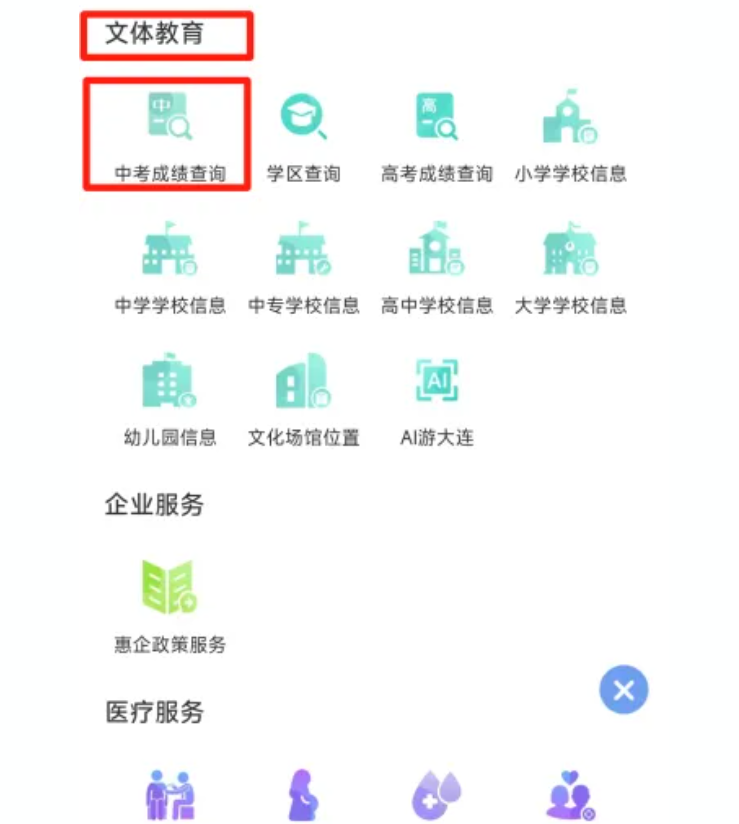 進入【更多服務(wù)】后,找到文體教育模塊的【中考成績查詢】圖標(biāo)。