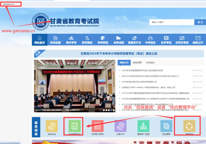 訪問甘肅省教育考試院:https://www.ganseea.cn,點(diǎn)擊“信息查詢”模塊進(jìn)入查詢頁面或直接輸入網(wǎng)址https://kw.ganseea.cn/grade/admission進(jìn)行查詢,或點(diǎn)擊“綜合管理平臺”模塊,訪問“考生入口”并登錄后進(jìn)行查詢。