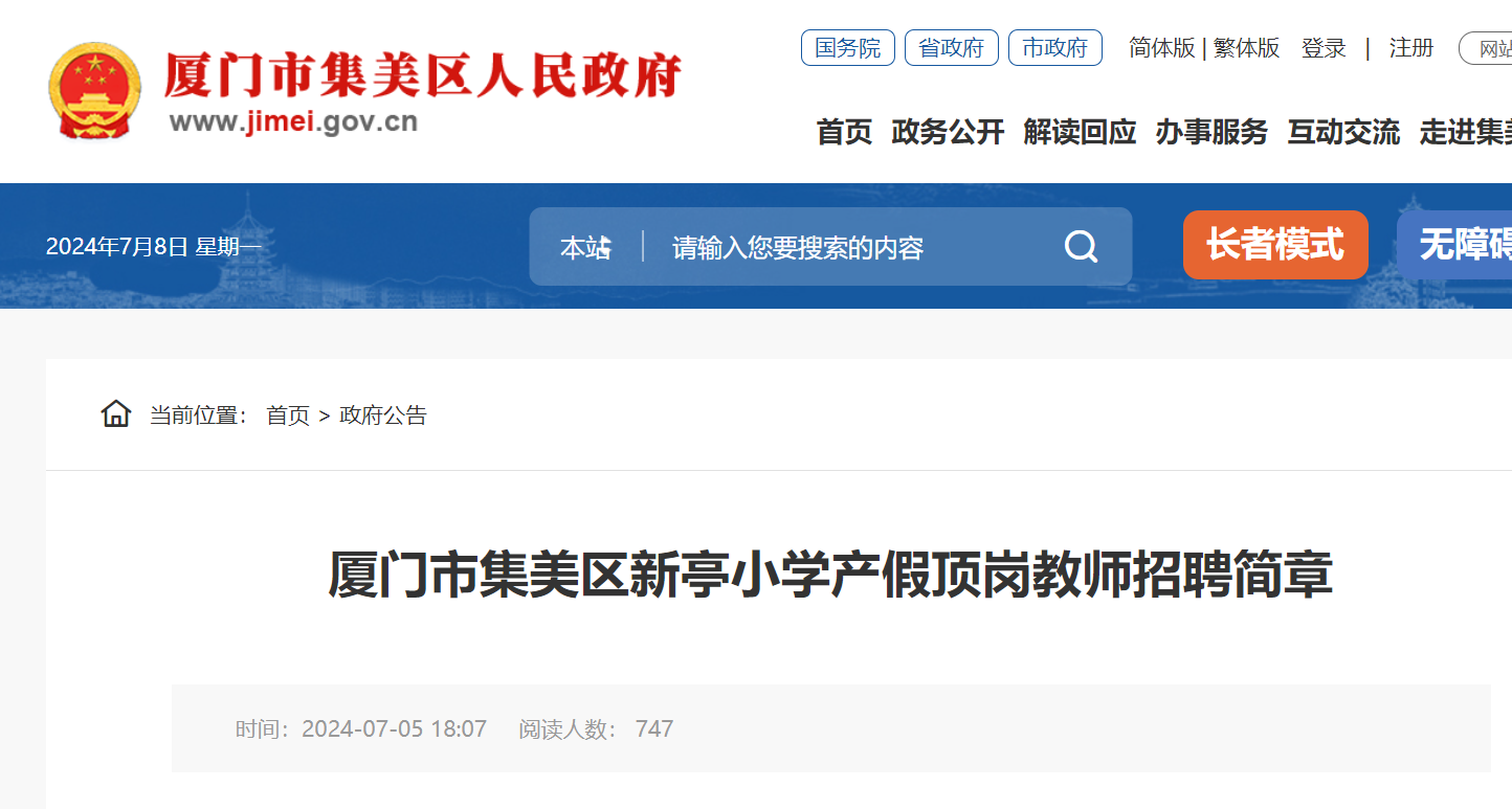 2024福建廈門市集美區(qū)新亭小學(xué)產(chǎn)假頂崗教師招聘簡章已發(fā)布,報(bào)名時(shí)間:2024年7月5日至7月19日?,F(xiàn)將招聘公告原文發(fā)布如下: