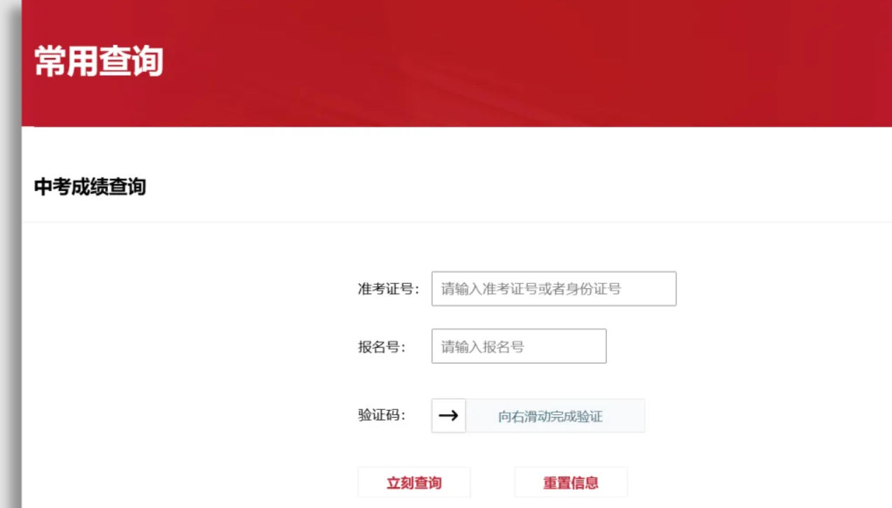 第三步,進(jìn)入“中考成績(jī)查詢(xún)”頁(yè)面,輸入準(zhǔn)考證號(hào)和報(bào)名號(hào),向右滑動(dòng)完成驗(yàn)證,點(diǎn)擊“立刻查詢(xún)”即可顯示中考成績(jī)(如下圖所示)。