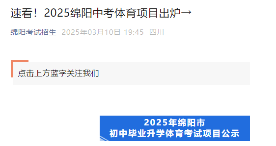 經(jīng)過公開抽簽,現(xiàn)將2025年綿陽市初中畢業(yè)升學(xué)體育考試項(xiàng)目公示如下。