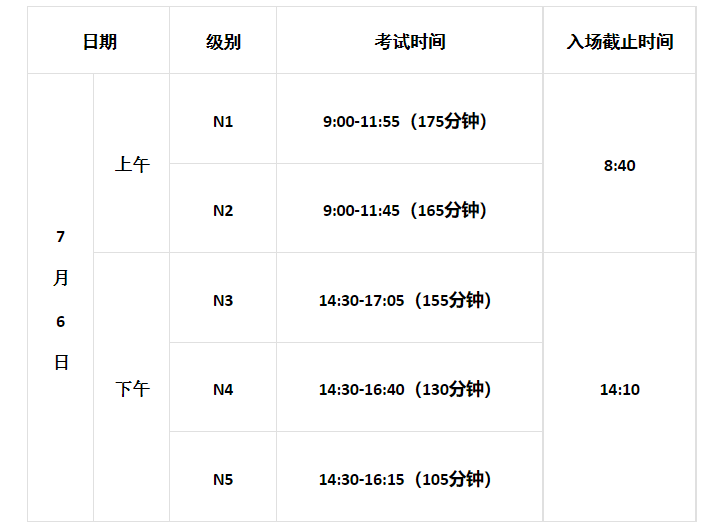 2025年第一次青海日本語能力測試JLPT考試時間為7月6日,各級別難度從低到高依次為N5,N4,N3,N2,N1,本次考試開考N1至N5五個級別,具體時間如下: