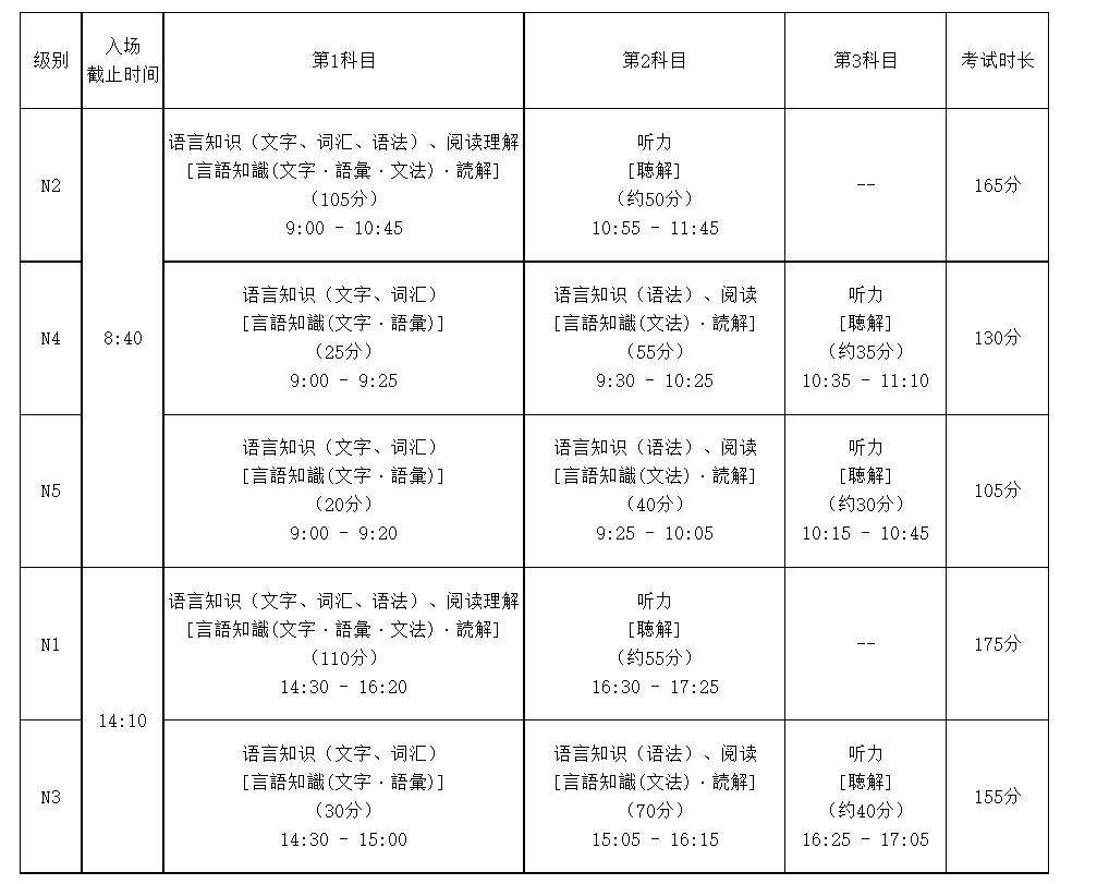 考生須按照準(zhǔn)考證上規(guī)定的具體時間參加考試,N1、N2級別8:40截止入場;N3、N4、N5級別14:10截止入場??荚嚱Y(jié)束前,考生不得離開考場。