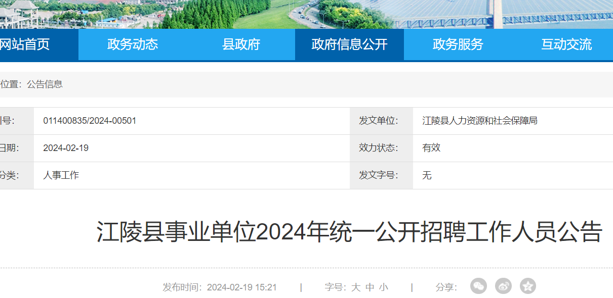 江陵縣2024年度公開(kāi)招聘事業(yè)單位工作人員公告在江陵縣人民政府網(wǎng)發(fā)布,具體網(wǎng)址如下: