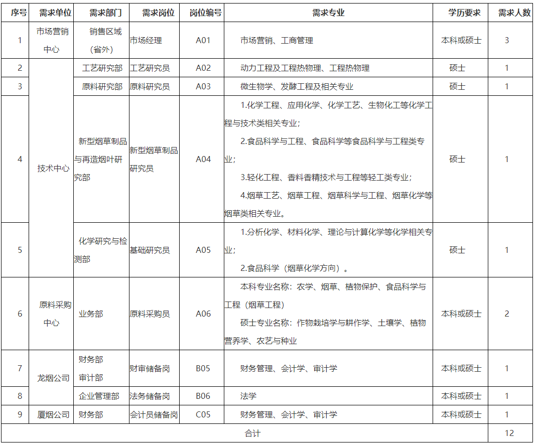 具體招聘單位為福建中煙市場(chǎng)營(yíng)銷中心、技術(shù)中心、原料采購(gòu)中心及下屬龍煙公司和廈煙公司?,F(xiàn)竭誠(chéng)歡迎優(yōu)秀應(yīng)屆高校畢業(yè)生加盟福建中煙。具體招聘信息如下: