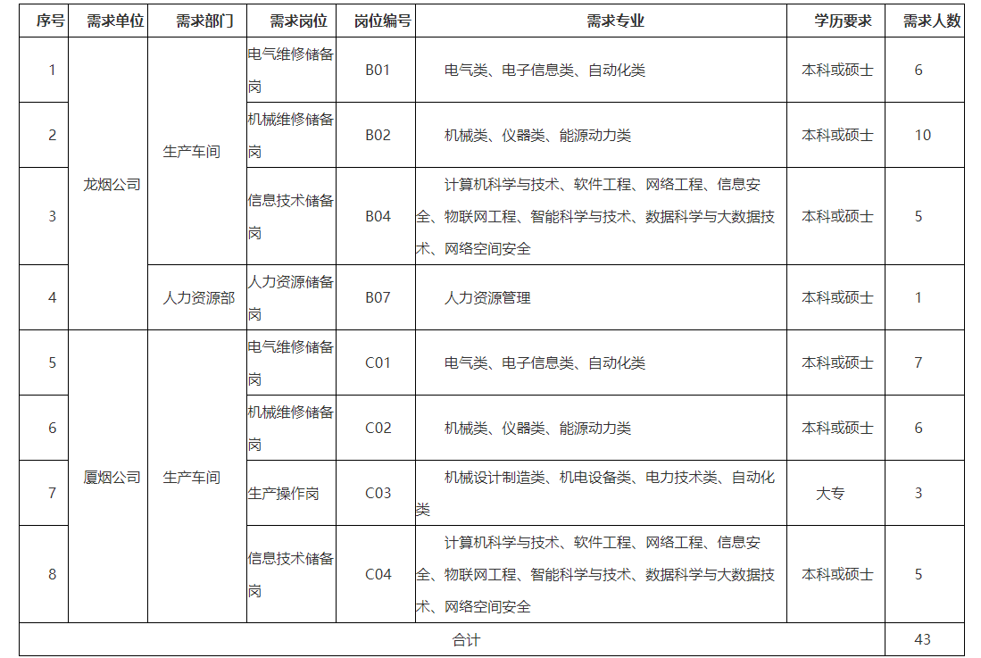 (3)龍煙公司、廈煙公司非生產(chǎn)車間崗位,根據(jù)培養(yǎng)計(jì)劃安排到車間工作,根據(jù)崗位需要進(jìn)行崗位調(diào)配。