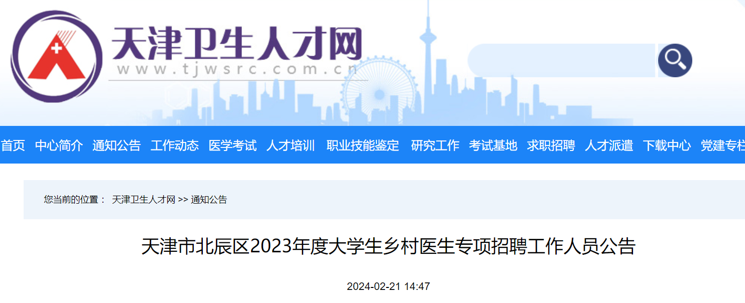 2023年度天津市北辰區(qū)大學(xué)生鄉(xiāng)村醫(yī)生專項(xiàng)招聘工作人員公告已發(fā)布,報(bào)名時(shí)間:2024年2月26日上午9:00至3月2日上午9:00?,F(xiàn)將招聘公告原文發(fā)布如下:
