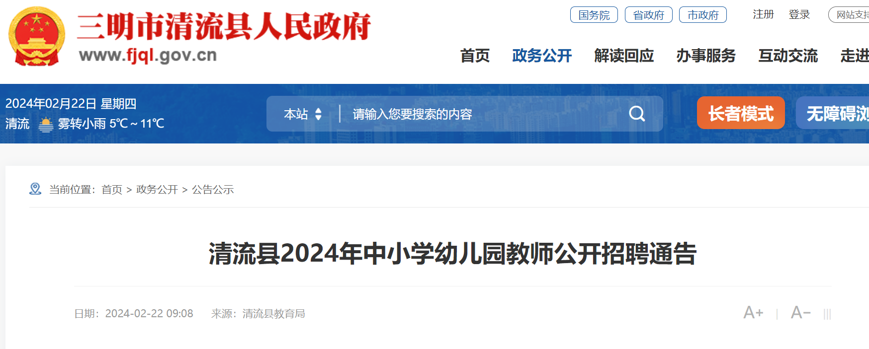 2024年福建三明清流縣中小學幼兒園教師公開招聘通告已發(fā)布,報名時間:2024年3月8日8:00(系統(tǒng)開啟)-3月14日17:30(系統(tǒng)關閉),逾期不再受理?,F(xiàn)將招聘公告原文發(fā)布如下: