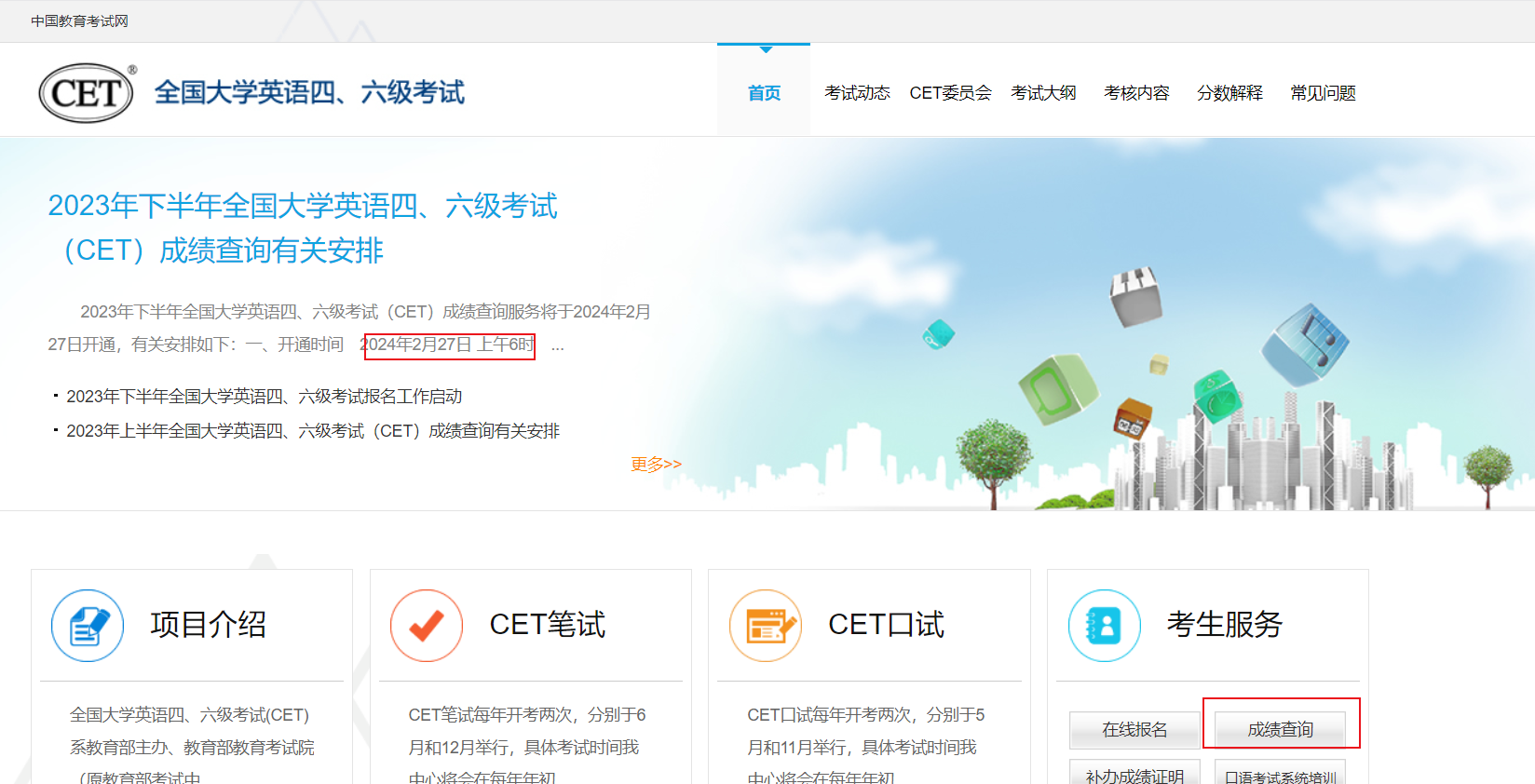 從全國(guó)大學(xué)英語(yǔ)四、六級(jí)考試(CET)-中國(guó)教育考試網(wǎng)發(fā)布的《2023年下半年全國(guó)大學(xué)英語(yǔ)四、六級(jí)考試(CET)成績(jī)查詢(xún)有關(guān)安排》得知,2023下半年海南英語(yǔ)四級(jí)成績(jī)查詢(xún)時(shí)間、方式及查分入口已公布,2024年2月27日上午6時(shí)起查詢(xún)筆試和口試成績(jī),具體詳情如下: