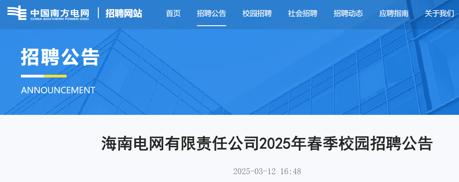 2025年春季海南電網(wǎng)有限責(zé)任公司校園招聘公告已發(fā)布,簡歷投遞時(shí)間:即日起至3月21日24∶00。現(xiàn)將招聘公告原文發(fā)布如下: