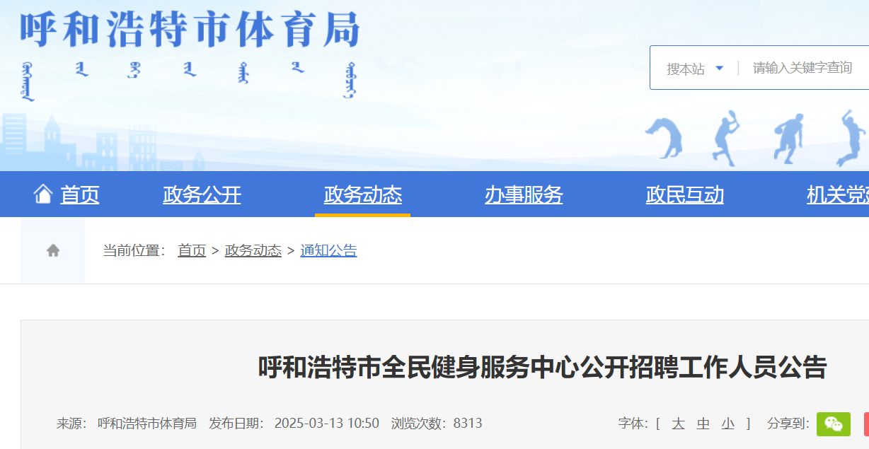 根據(jù)工作需要和有關(guān)規(guī)定,呼和浩特市全民健身服務(wù)中心2025年3月公開招聘工作人員10人。