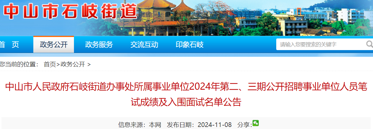 小編根據(jù)中山市石岐街道發(fā)布“中山市人民政府石岐街道辦事處所屬事業(yè)單位2024年第二、三期公開招聘事業(yè)單位人員筆試成績及入圍面試名單公告”得知,2024廣東中山市人民政府石岐街道辦事處所屬事業(yè)單位第二、三期招聘事業(yè)單位人員筆試成績及入圍面試名單已公布。