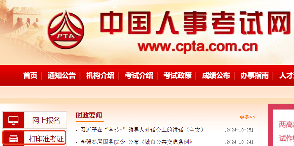 1、打開中國(guó)人事考試網(wǎng),點(diǎn)擊左上角“打印準(zhǔn)考證”;
