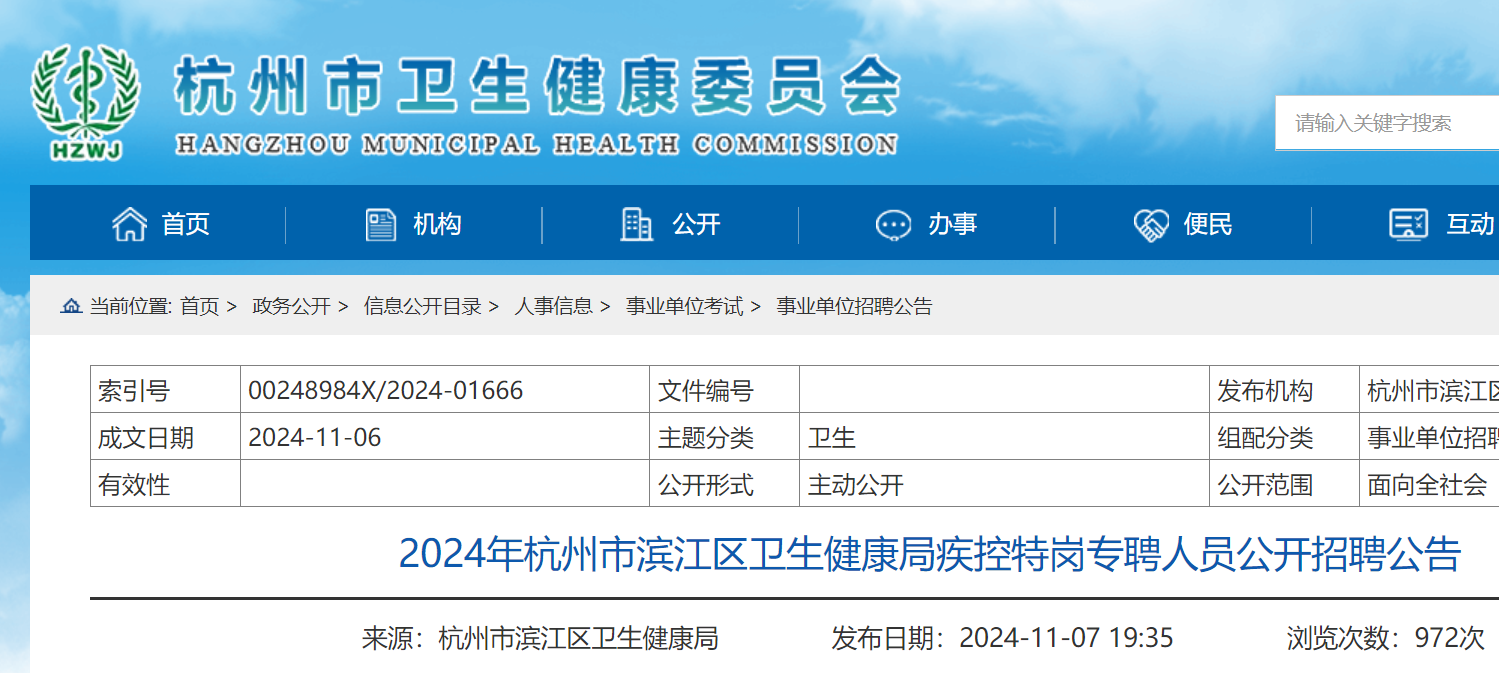 2024年浙江杭州市濱江區(qū)衛(wèi)生健康局招聘疾控特崗專聘人員8人公告已發(fā)布,報(bào)名時(shí)間:2024年11月11日9時(shí)—2024年11月19日17時(shí)?,F(xiàn)將招聘公告原文發(fā)布如下:
