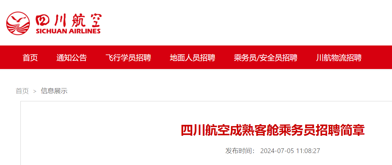 2024四川航空成熟客艙乘務(wù)員招聘簡章已發(fā)布,通信地址:成都雙流國際機場川航大廈4號樓508室(郵編:610202)?,F(xiàn)將招聘公告原文發(fā)布如下: