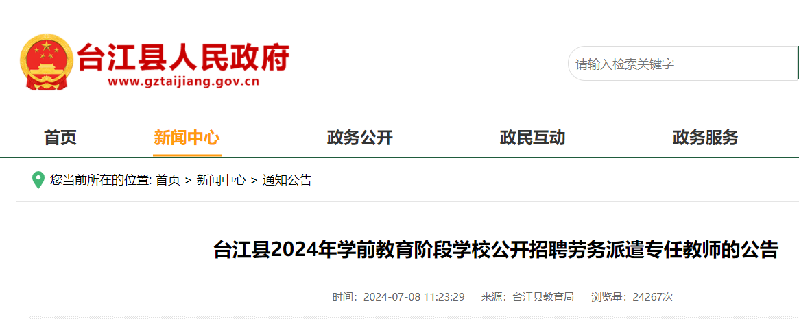 2024年貴州黔東南臺江縣學前教育階段學校公開招聘勞務派遣專任教師公告已發(fā)布,報名時間:2024年7月11日—2024年7月14日,現(xiàn)將招聘公告原文發(fā)布如下: