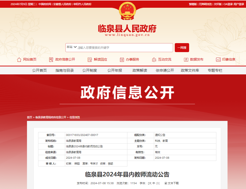 2024年安徽阜陽臨泉縣縣內(nèi)教師流動公告已發(fā)布,現(xiàn)將招聘公告原文發(fā)布如下: