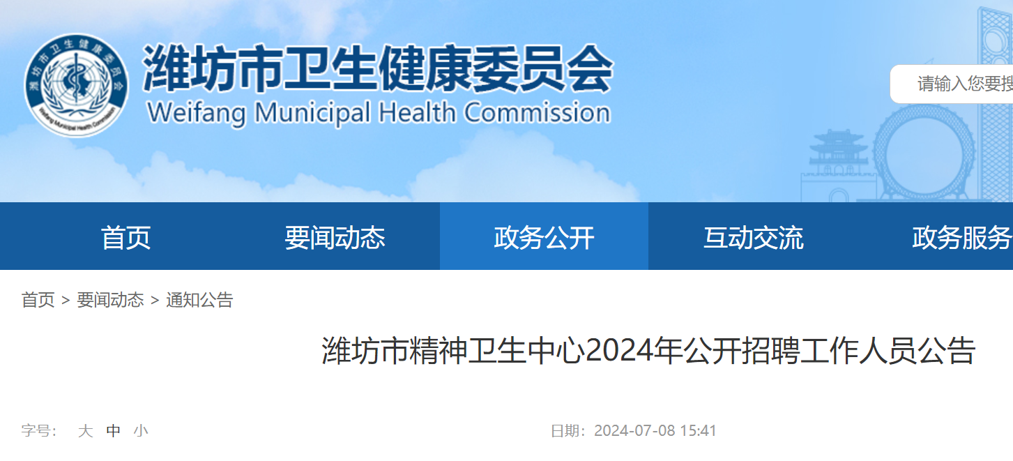 根據(jù)《事業(yè)單位人事管理條例》(國務(wù)院令第652號)、《事業(yè)單位公開招聘人員暫行規(guī)定》(人事部令第6號)、《山東省事業(yè)單位公開招聘人員實施辦法》(魯人社規(guī)〔2022〕2號)、《2024年市衛(wèi)健委直屬單位公開招聘工作總體方案》等文件規(guī)定,現(xiàn)將濰坊市精神衛(wèi)生中心2024年公開招聘工作人員有關(guān)事項公告如下。