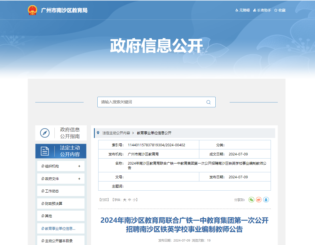 2024年廣東廣州南沙區(qū)教育局聯(lián)合廣鐵一中教育集團第一批招聘南沙區(qū)鐵英學(xué)校教師公告已發(fā)布,報名時間:2024年7月15日9:00-7月19日17:00?,F(xiàn)將招聘公告原文發(fā)布如下: