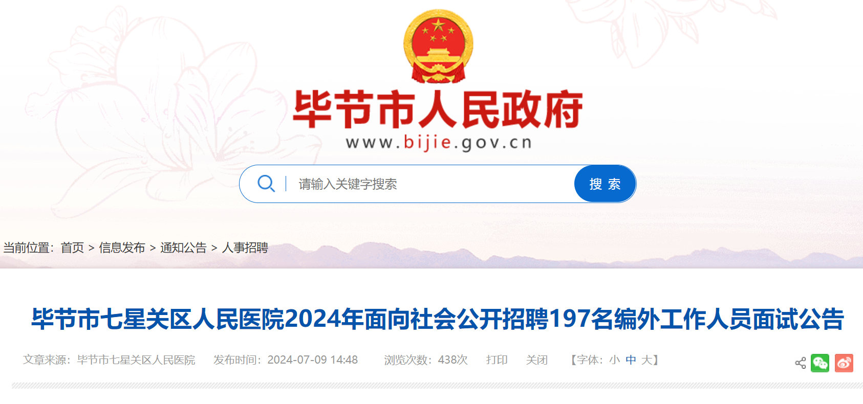2024年貴州畢節(jié)市七星關(guān)區(qū)人民醫(yī)院面向社會(huì)公開(kāi)招聘197名編外工作人員面試公告已發(fā)布,面試時(shí)間:2024年7月14日?,F(xiàn)將原文發(fā)布如下: