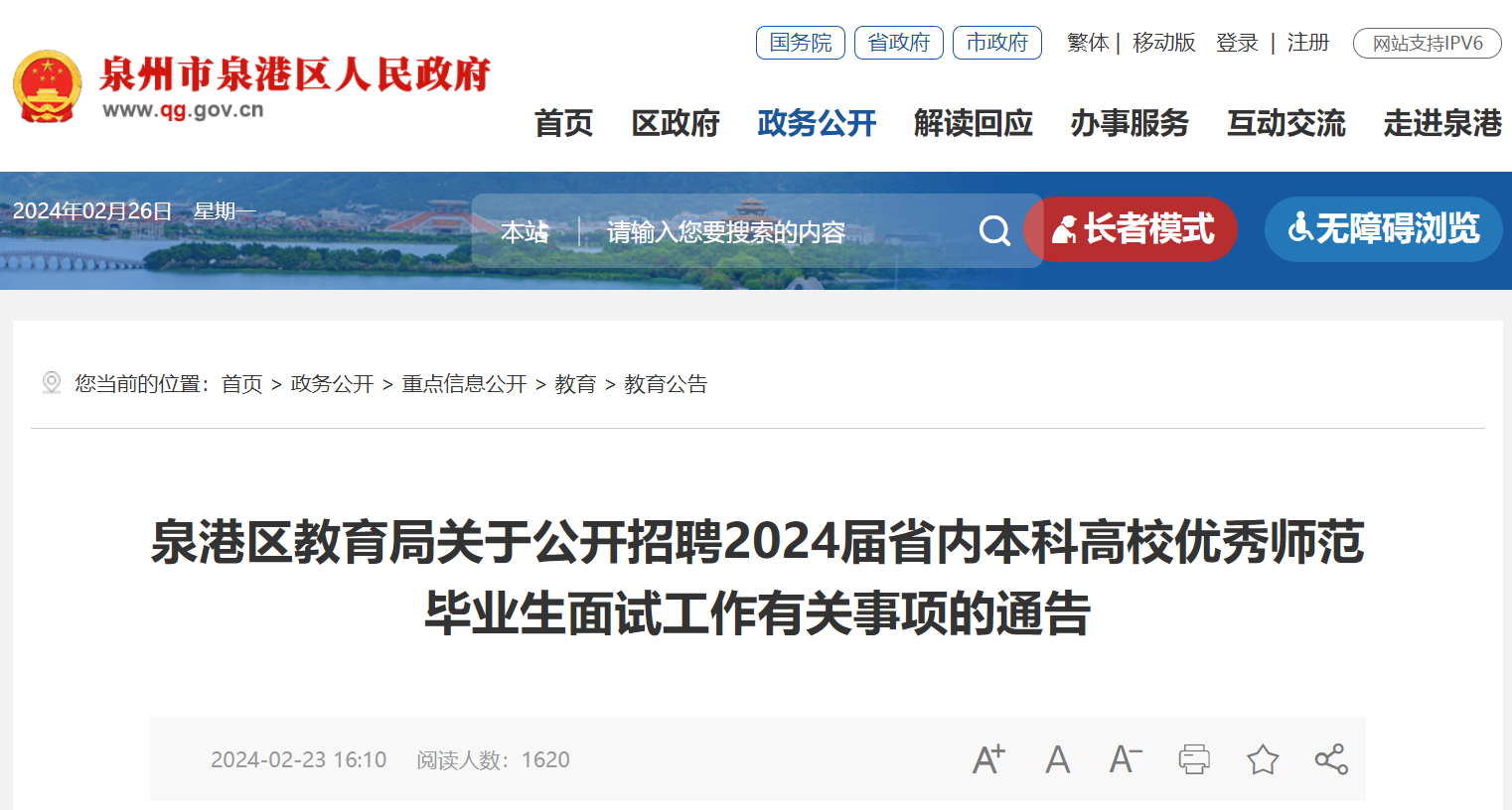 福建泉州泉港區(qū)教育局公開招聘2024屆省內(nèi)本科高校優(yōu)秀師范畢業(yè)生面試工作有關(guān)事項通告已發(fā)布,面試時間:2024年2月29日(星期四)。現(xiàn)將原文發(fā)布如下: