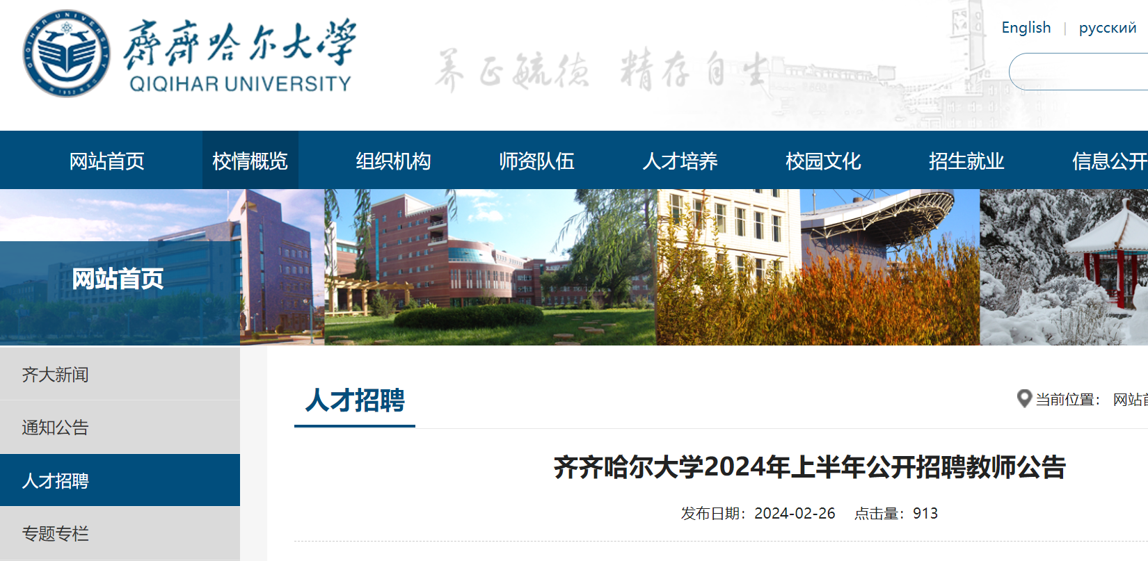 2024年上半年黑龍江齊齊哈爾大學(xué)公開(kāi)招聘教師公告已發(fā)布,碩士應(yīng)聘人員報(bào)名時(shí)間:2024年2月27日9:00至2024年3月27日9:00;博士應(yīng)聘人員報(bào)名時(shí)間:2024年4月1日至2024年6月30日?,F(xiàn)將招聘公告原文發(fā)布如下:
