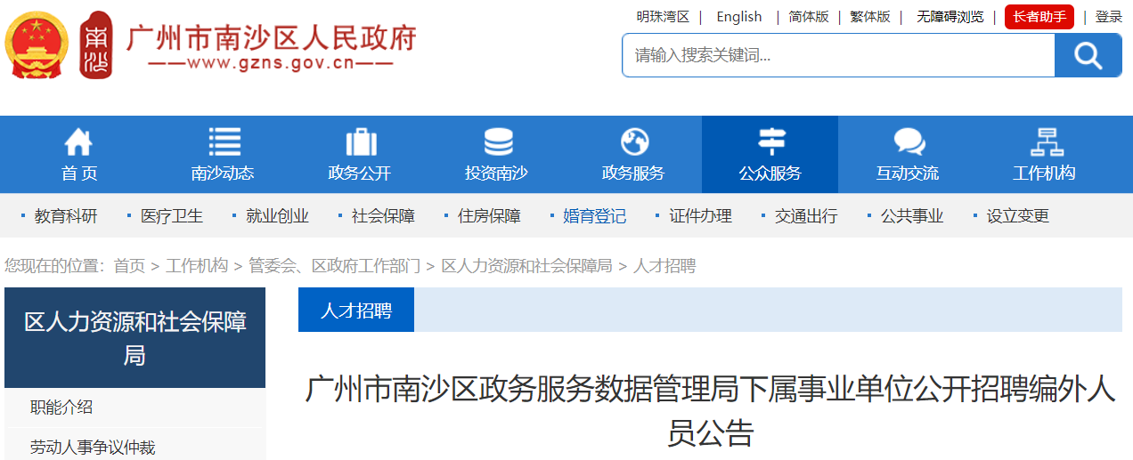 廣州市南沙區(qū)政務(wù)服務(wù)數(shù)據(jù)管理局下屬事業(yè)單位廣州南沙政務(wù)服務(wù)中心,因工作需要特向社會(huì)公開(kāi)招聘普通輔助類(lèi)編外人員1名,現(xiàn)將有關(guān)事項(xiàng)公告如下: