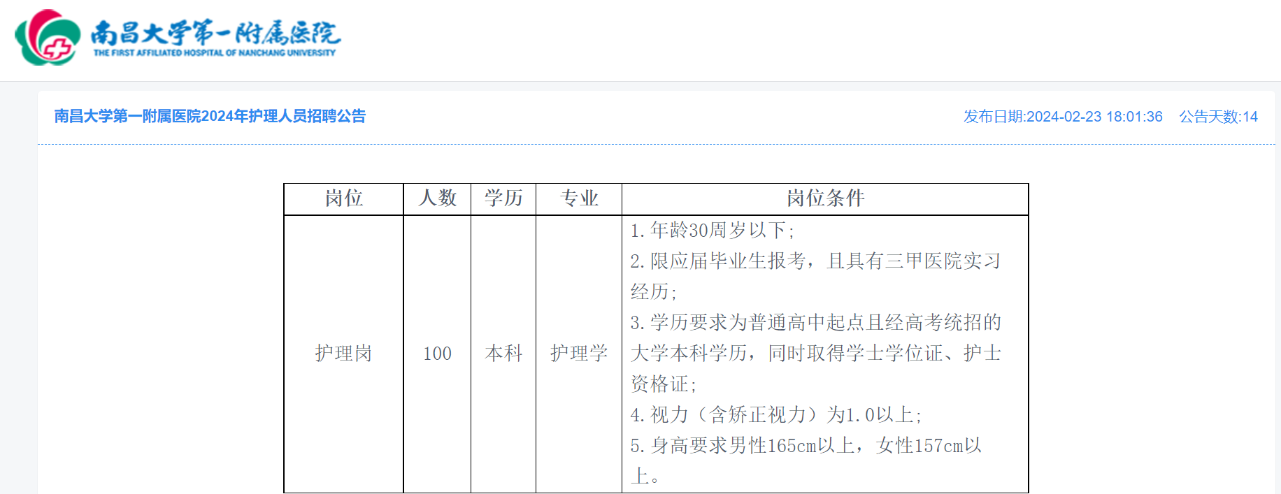 2024年江西南昌大學(xué)第一附屬醫(yī)院護(hù)理人員招聘100人,報(bào)名時(shí)間:即日起至2024年3月7日?,F(xiàn)將招聘公告原文發(fā)布如下: