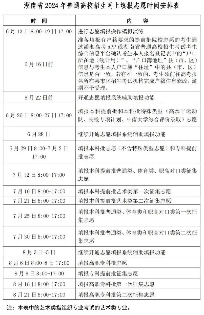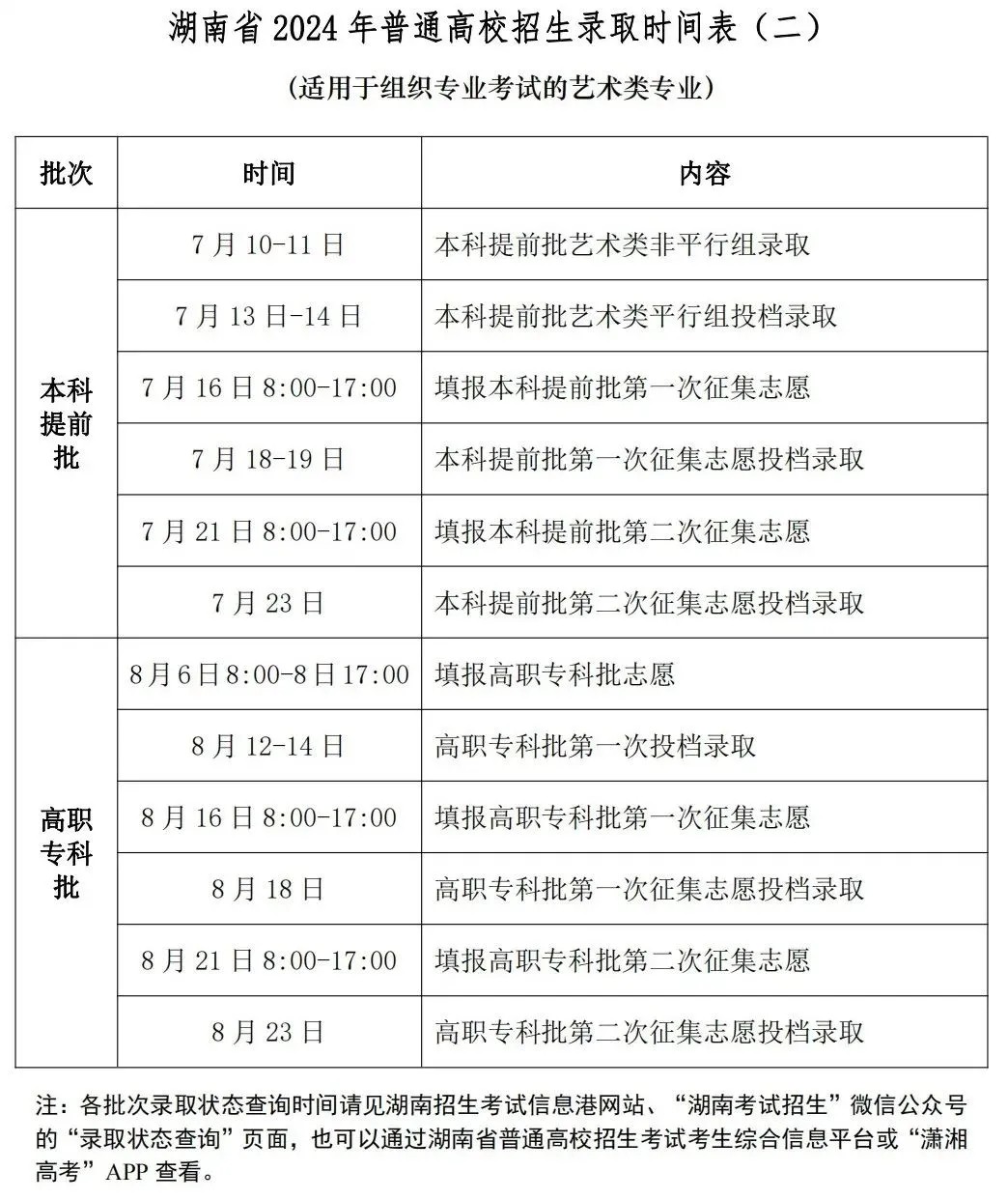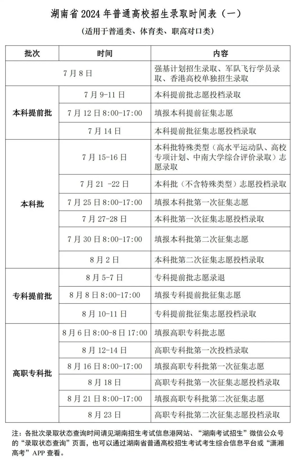7月8日起,湖南高招錄取工作正式啟動。今年我省高招錄取分為普通類、藝術類、體育類,其中普通類分為本科提前批、本科批、??铺崆芭?、高職??婆?個批次。普通類本科批中先進行特殊類型(高水平運動員、高校專項計劃、中南大學綜合評價錄取)志愿錄取,再進行普通志愿投檔錄取。所有錄取工作將于8月23日結束。為期47天。