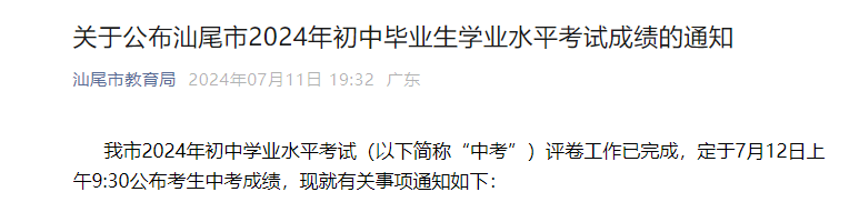 從汕尾市教育局獲悉,2024年廣東汕尾初中畢業(yè)生學(xué)業(yè)水平考試成績查詢通知已公布,7月12日9:30起查分,具體詳情如下: