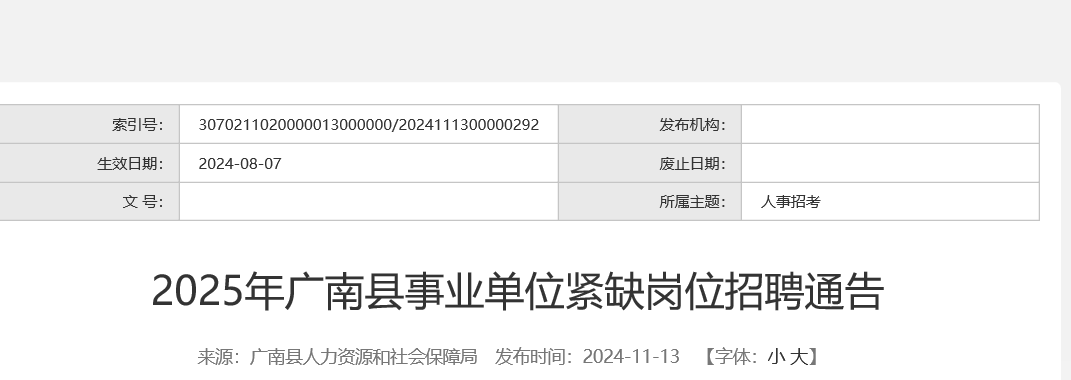 為深入實(shí)施新時代人才強(qiáng)縣戰(zhàn)略,加快引進(jìn)高層次急需緊缺人才,推進(jìn)高素質(zhì)專業(yè)化干部隊(duì)伍建設(shè)。根據(jù)《事業(yè)單位人事管理?xiàng)l例》(中華人民共和國國務(wù)院令652號)、《事業(yè)單位公開招聘人員暫行規(guī)定》(中華人民共和國人事部令第6號)、《中共中央組織部人力資源社會保障部關(guān)于進(jìn)一步做好事業(yè)單位公開招聘工作的通知》(人社部發(fā)〔2024〕57號)、《云南省事業(yè)單位公開招聘工作人員辦法》(云人社發(fā)〔2016〕182號)的規(guī)定,結(jié)合我縣實(shí)際,經(jīng)縣人民政府研究,州人民政府批準(zhǔn),現(xiàn)將2025年廣南縣事業(yè)單位緊缺崗位招聘有關(guān)事項(xiàng)通告如下。