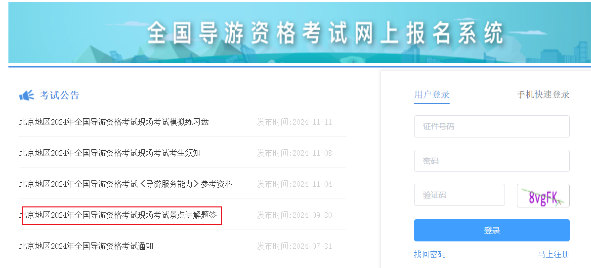 從全國(guó)導(dǎo)游資格考試網(wǎng)上報(bào)名系統(tǒng)獲悉,北京地區(qū)2024年全國(guó)導(dǎo)游資格考試現(xiàn)場(chǎng)考試景點(diǎn)講解題簽已公布,具體詳情如下: