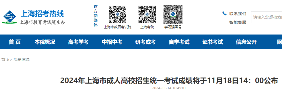 從上海市教育考試院了解到,2024年上海成人高校招生考試成績將于11月18日14:00公布,具體如下: