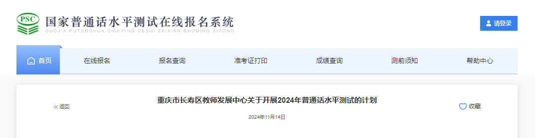 從國(guó)家普通話水平測(cè)試在線報(bào)名系統(tǒng)獲悉,重慶市長(zhǎng)壽區(qū)教師發(fā)展中心2024年普通話考試時(shí)間為12月4日起,報(bào)名時(shí)間為11月18-19日,具體詳情如下: