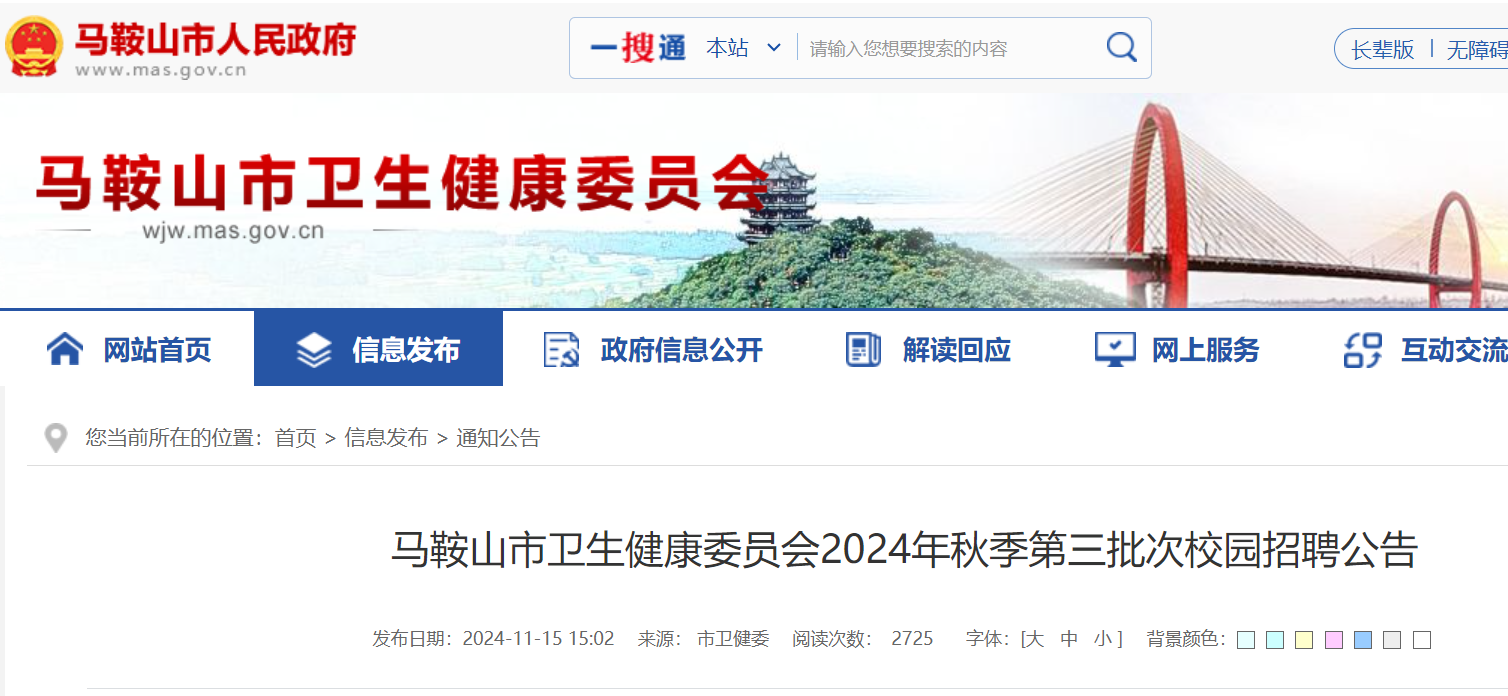 為進一步加強全市醫(yī)療衛(wèi)生人才隊伍建設(shè),加大對醫(yī)療衛(wèi)生人才引進力度,全面提升我市醫(yī)療衛(wèi)生服務(wù)水平,結(jié)合市屬醫(yī)療衛(wèi)生機構(gòu)發(fā)展需求,馬鞍山市衛(wèi)生健康委員會組織開展2024年秋季第三批次校園招聘工作。按照事業(yè)單位公開招聘人員相關(guān)規(guī)定,結(jié)合工作實際,現(xiàn)將有關(guān)事項公告如下: